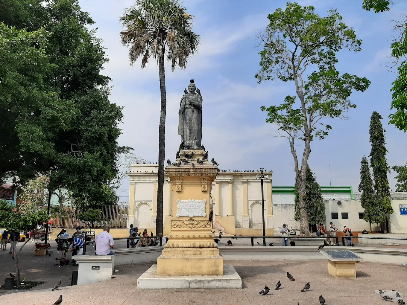 Una pequeña plaza urbana en el corazón del centro histórico de San Salvador, conocida por su fachada de iglesia colonial restaurada y el monumento al prócer José Matías Delgado